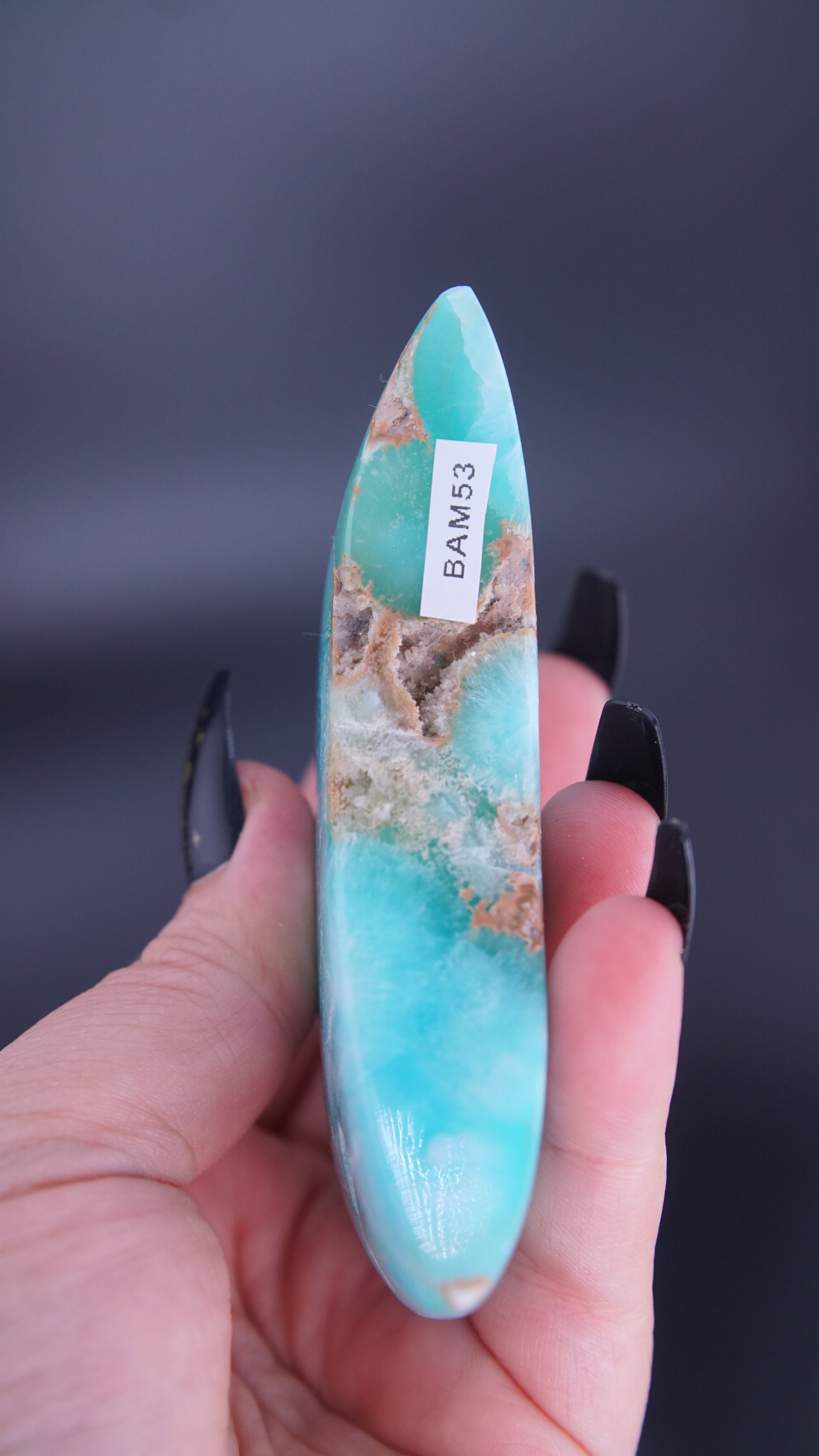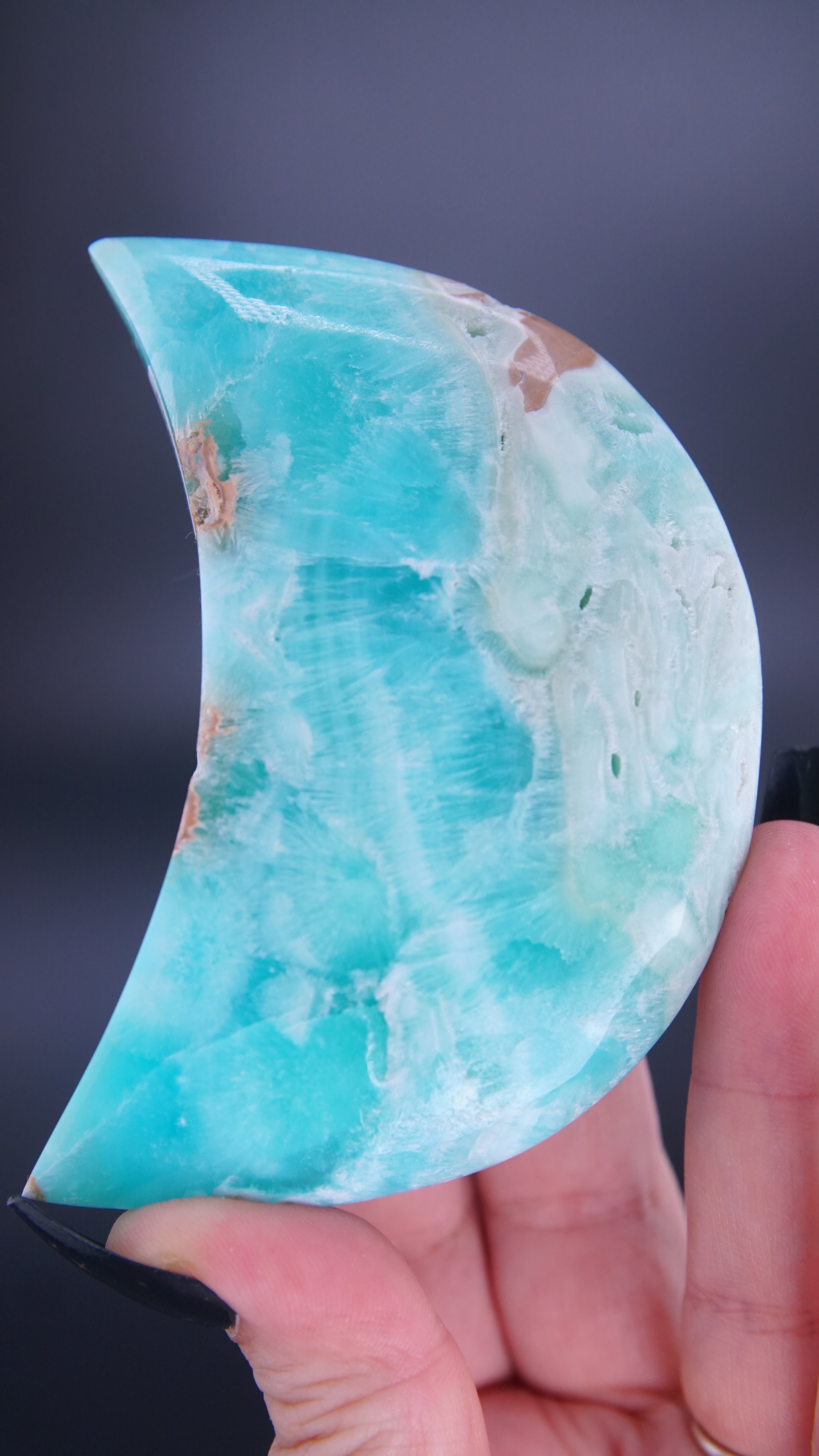 STUNNING and gorgeous color in this Blue Aragonite Calcite moon. Super high quality.