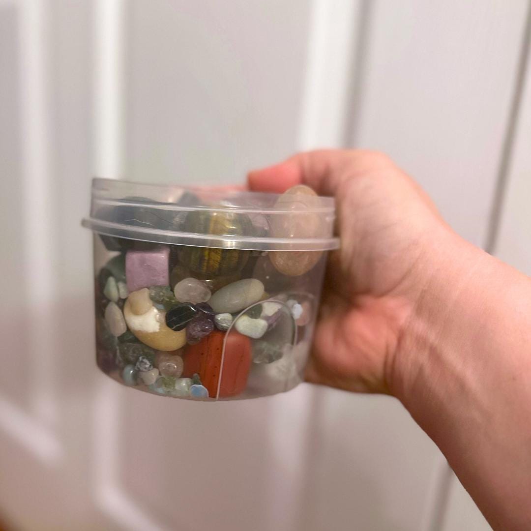 Beautiful mystery crystal scoop in a jaw. Each crystal is intuitively selected, but if you're feeling a certain way and would like crystals hand selected to aid you in prosperity, wellness, clarity, balance, etc., simply send us a message and we'll do our best to create a box perfect for your needs. Requests for specific crystals unfortunately cannot be accepted at this time.