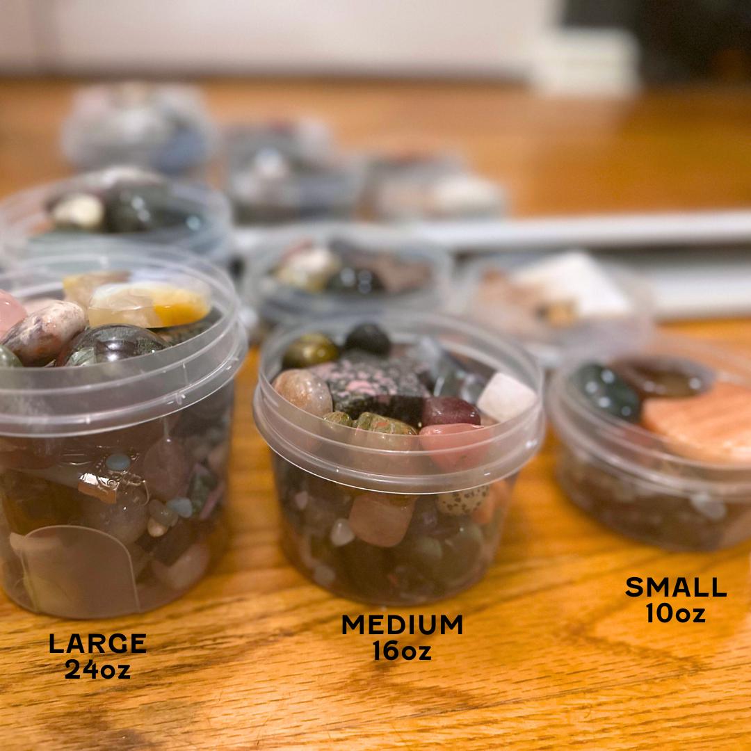 Tumbles, chips, carvings, towers, spheres, raw stones, manmade stones (such as opalite and goldstone), aura coated stones, jewelry, and more.